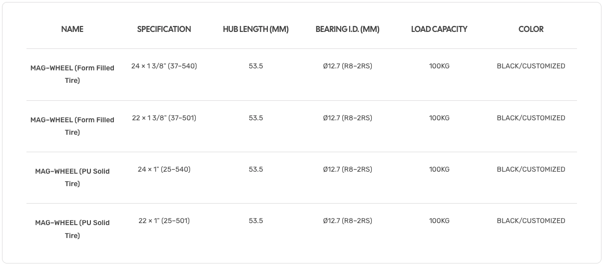 MAG-WHEEL (Form-Filled Tire) 24 × 1 3/8” (37–540) 53.5 Ø12.7 (R8–2RS) 100 kg Black/Customized