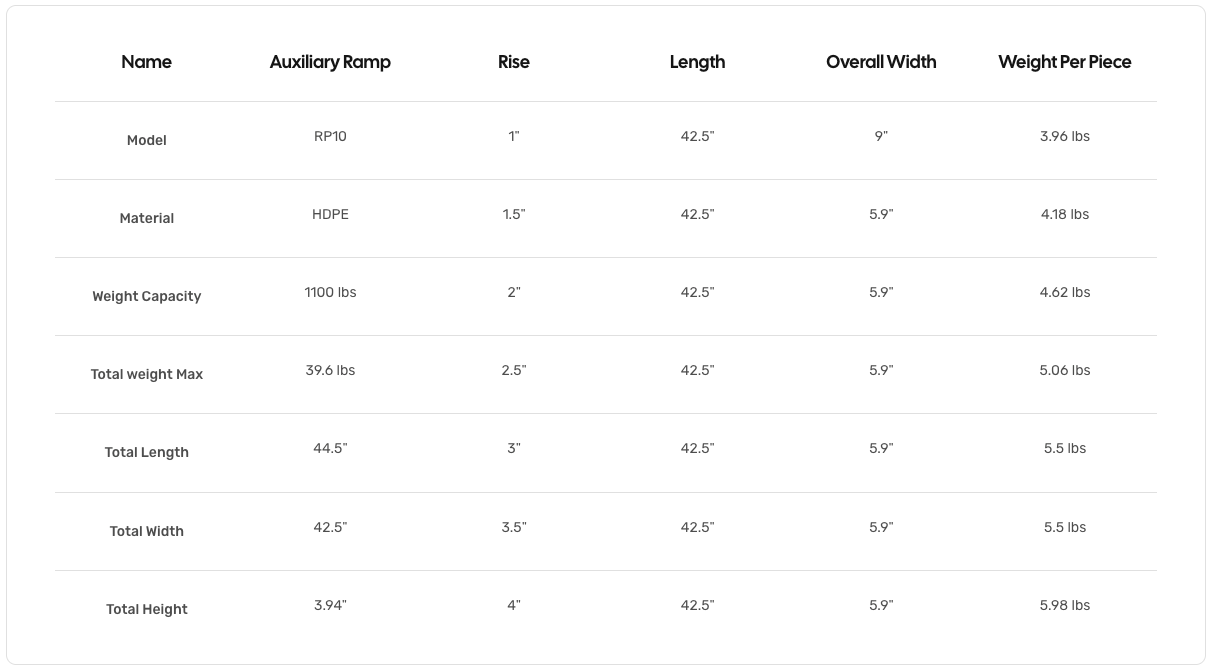 EZ Ramp RP10 HDPE 1100 lbs 39.6 lbs 42.5" 5.9"–9" 44.5" 42.5" 3.94"–4" 1"–4" 3.96–5.98 lbs